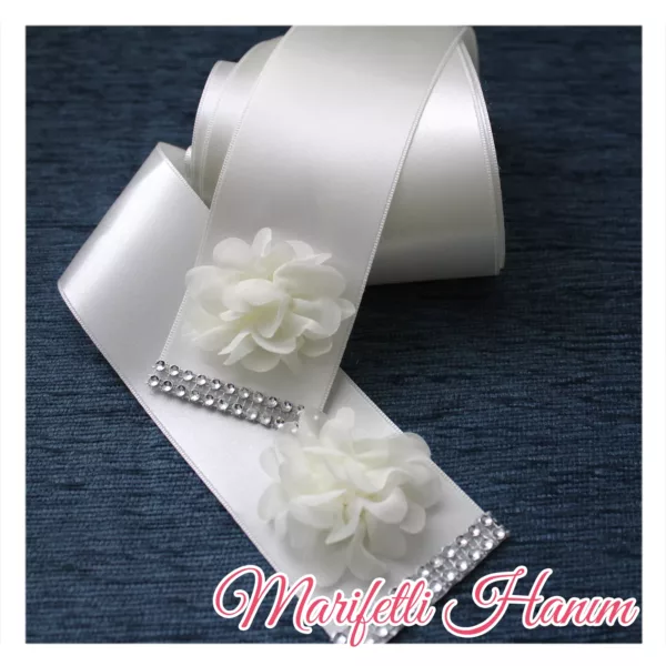 1 adet satın aldığınızda gelin ve damat için ayrı ayrı olmak üzere 2 adet beyaz parlak taş ve çiçeklerle süslenmiş takı kurdelesi gönderilecektir.