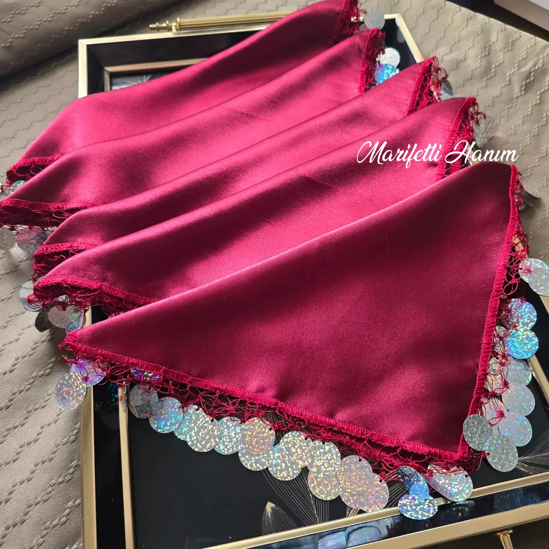 Bordo kına halay mendili kumaş ölçüsü 25 x25 cm'dir. Bordo kına mendili kumaş etrafına el oyası ve pul süslemesi ile hazırlanmıştır. Ürünlerimizin tamamı el emeğidir.