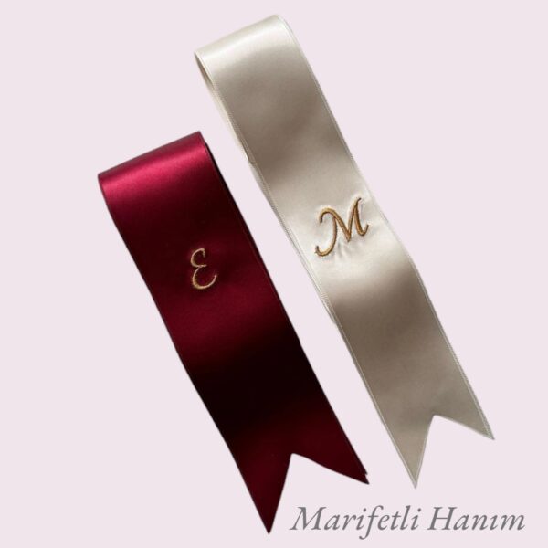 Bordo ve ekru harf nakışlı takı kurdelesi. Nakışlı takı kurdelesinde kırmızı, bordo, ekru ve siyah kurdele seçeneklerimiz mevcuttur.