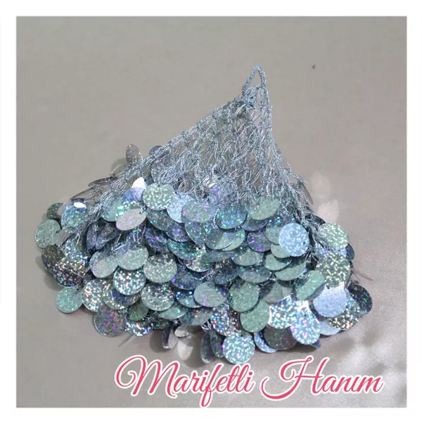 Gümüş Gelin Mendili gümüş rengi simli ip ve gümüş rengi pul ile hazırlanmıştır.
