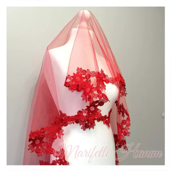 Gelin Duvakları serimizden kırmızı dantelli gelin duvağı
