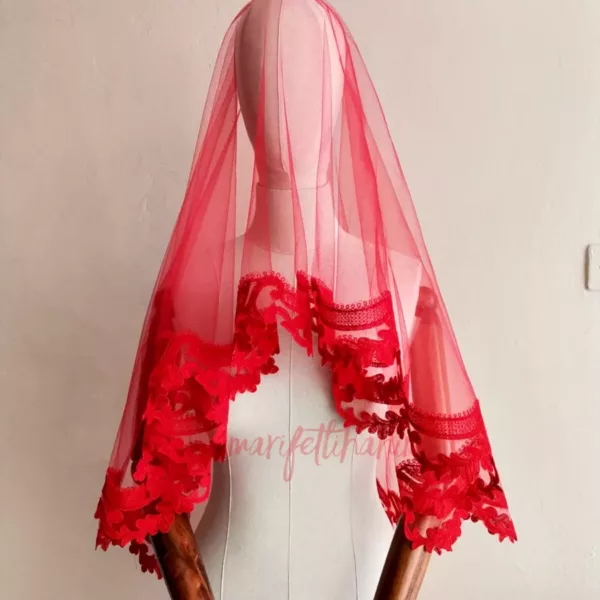 Duvağımız kırmızı fransız danteli süslenmiştir ve duvak çapı 1.50 metredir.