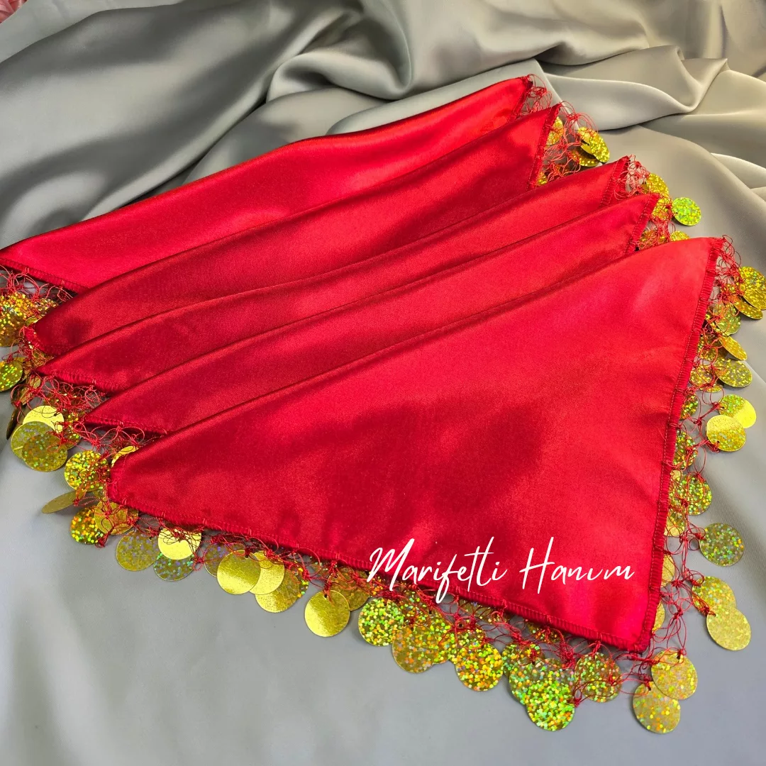 Kırmızı saten halay mendilinin kumaş ölçüsü 25 x25 cm’dir. Ve kumaş etrafına el oyası pul ya da boncuk süslemesi ile hazırlanmıştır. Ürünlerimizin tamamı el emeğidir.