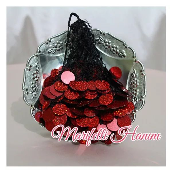 Kına gecelerinin vazgeçilmez gelin aksesuarı siyah ip ile oyalanmış kırmızı pullu halay mendili